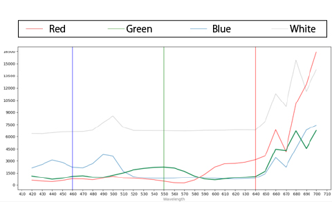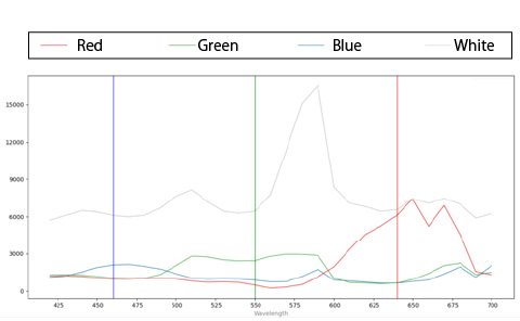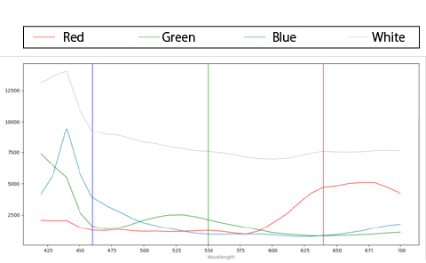 各色でスペクトルカーブが正しく出ていることが確認できた。